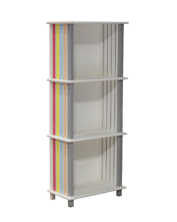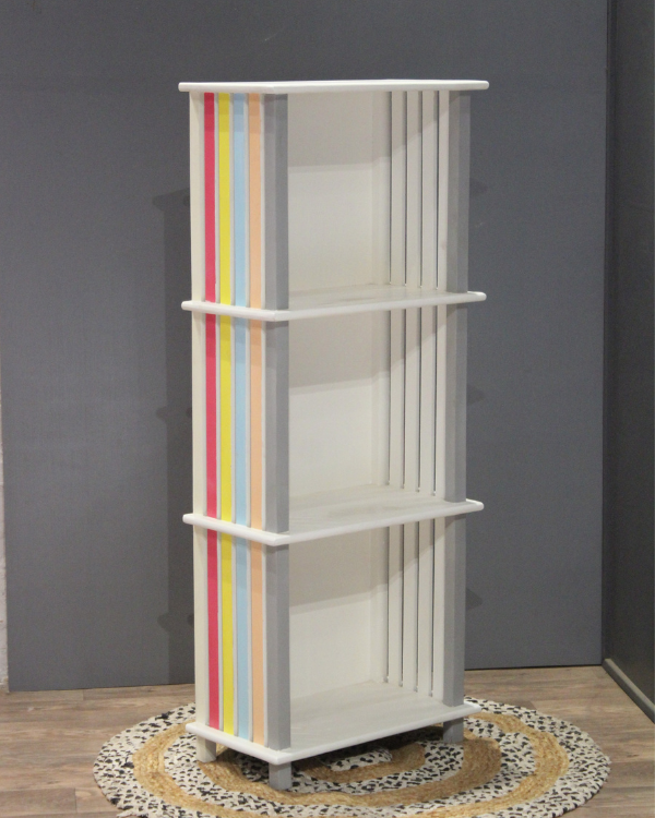 The bookshelf stands out with its unique design, adorned with beautiful coloured wood strips on both sides, creating a delightful contrast against the white finish.
