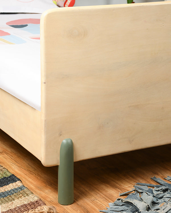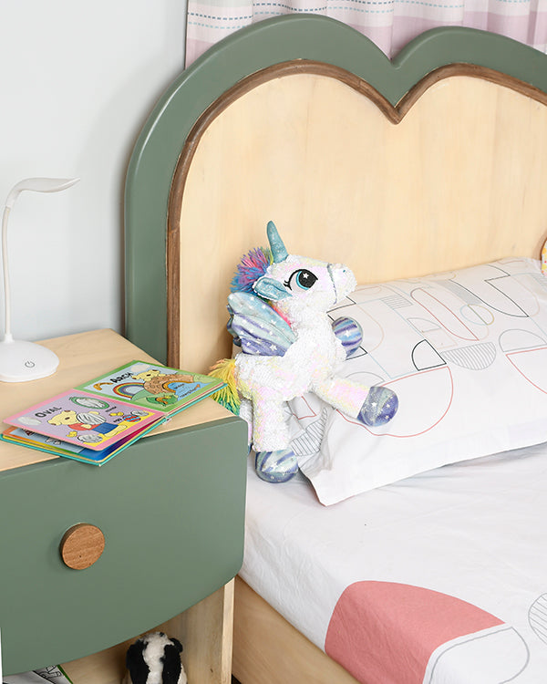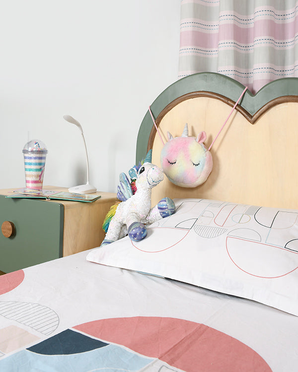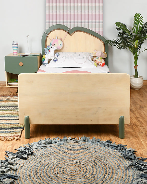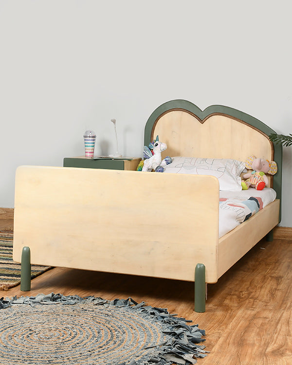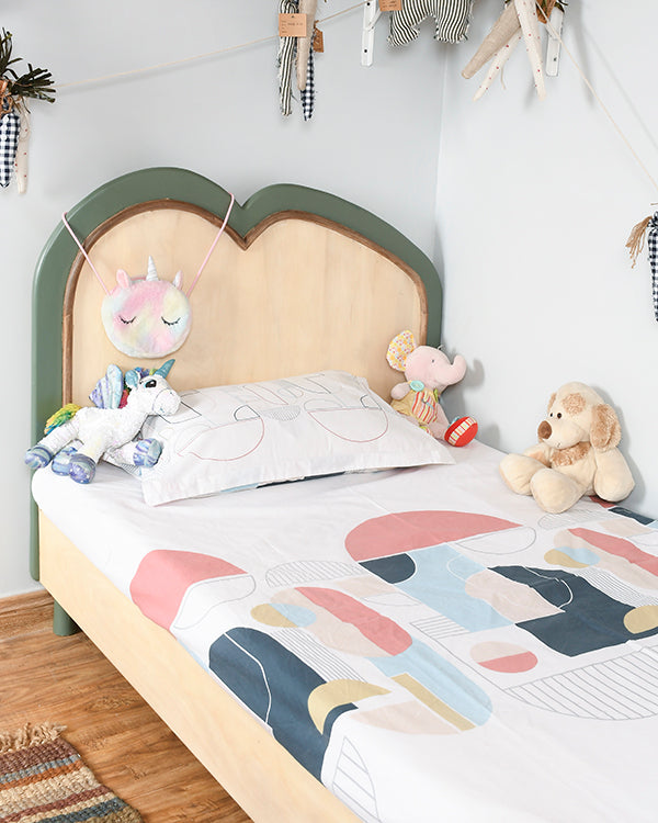 The standout feature is its curved headboard, adorned with soft pastel patina tones against a natural wooden base. This gentle color contrast creates a warm, calming environment while adding a cheerful pop of personality to the room. Whether styled with vibrant linens or kept minimal, the bed remains a showstopper.