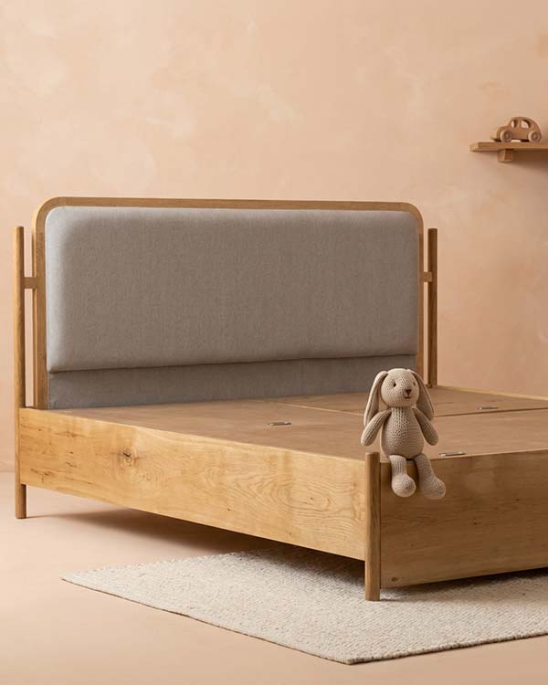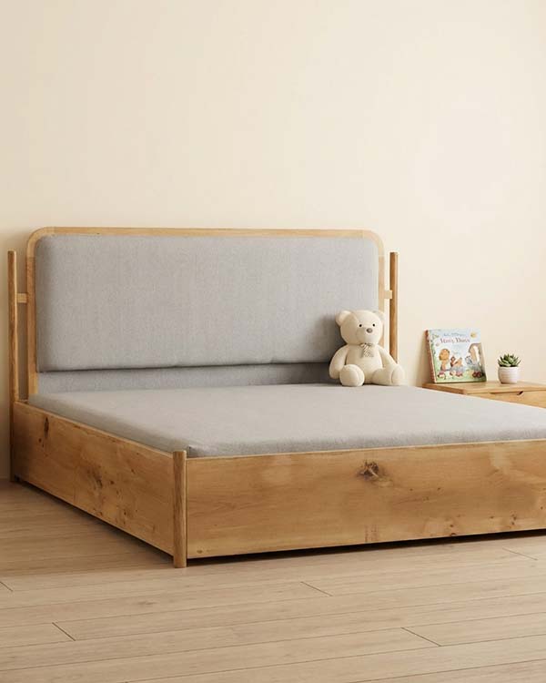 The handcrafted wooden frame highlights the beauty of natural grains, making every piece slightly unique. The padded upholstered headboard adds extra comfort for bedtime reading or relaxed lounging, while maintaining a soft, child-friendly look.