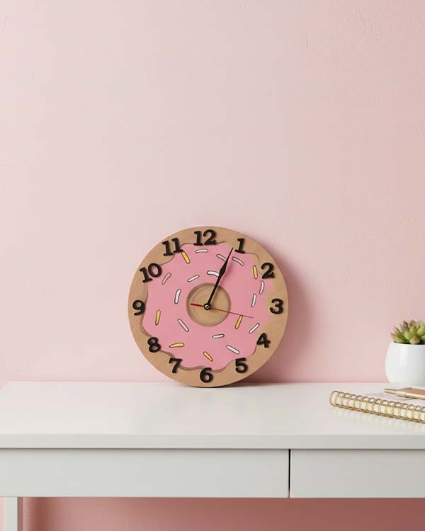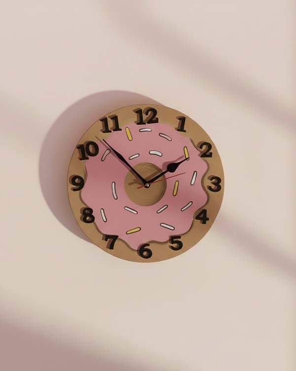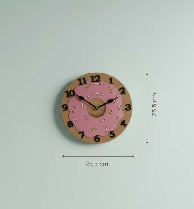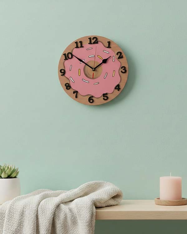 Whimsical Design: This clock features a charming doughnut shape with a brown "doughnut" base, topped with pink "creamy" icing and colourful sprinkles. Each detail is meticulously hand-painted to create a realistic and playful look.