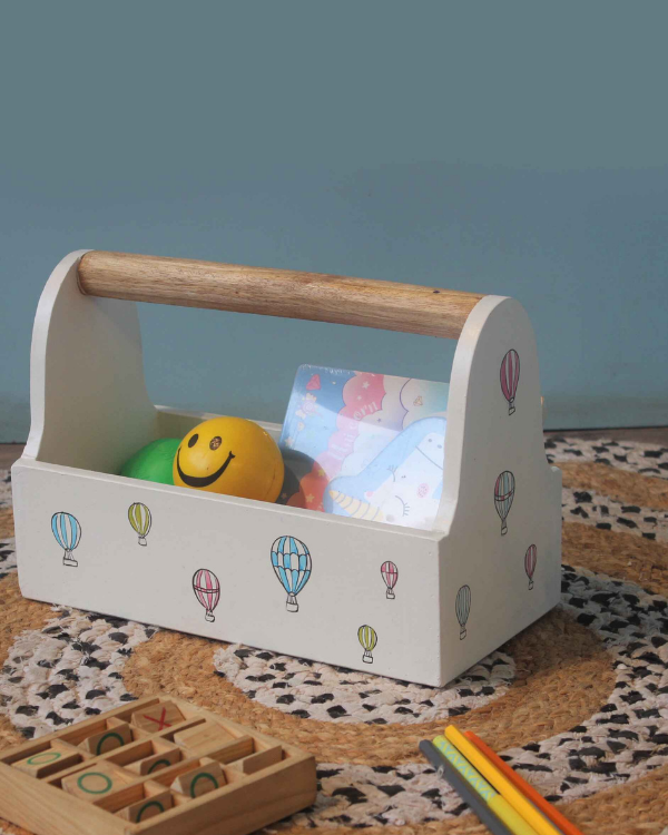 We designed this multipurpose handpainted small HOT air balloon themed tool kit for kids made from mango wood and MDF with the use of non-toxic paint for the safety of the child. In this multipurpose tool kit, the toddler can put their all little stuff like pens, markers, paintbrushes, toys, or all stationery stuff. A wooden tool set is an ideal gift for children over 3 years old. And inside it has one compartment.