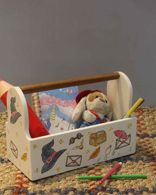 We designed this multipurpose Handpainted small Harry Potter-themed tool kit for kids made from mango wood and MDF with the use of non-toxic paint for the safety of the child. In this multipurpose tool kit, where the toddler can put their all little stuff like pens, markers, paintbrushes, toys, or all stationery stuff. A wooden tool set is an ideal gift for children over 3 years old.
