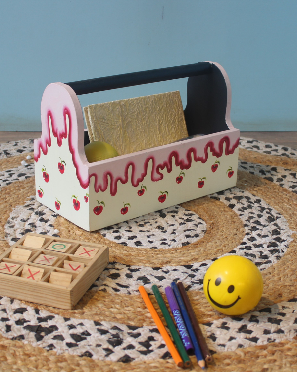 This fun little toolkit is sure to bring a smile to any mini painter or carpenter's face! A child’s imagination is triggered by these toys, which are cute in shape and in beautiful colors. Open-ended toys and materials can be used in many ways, inviting investigation and manipulation and fostering symbolic and complex play. And let their imagination come out from painting with this cute handpainted strawberry-themed caddy made from mango wood and MDF The simplicity of wood encourages dramatic play, painting, and construction.