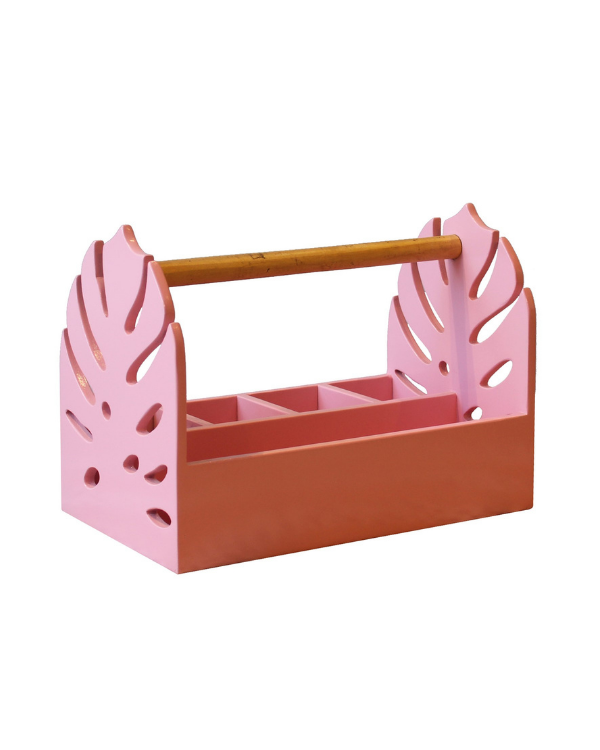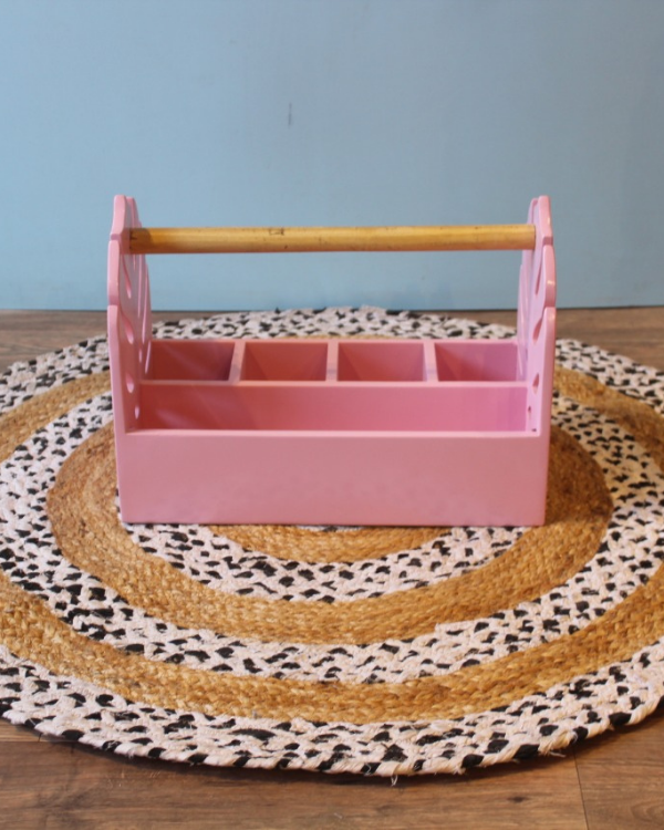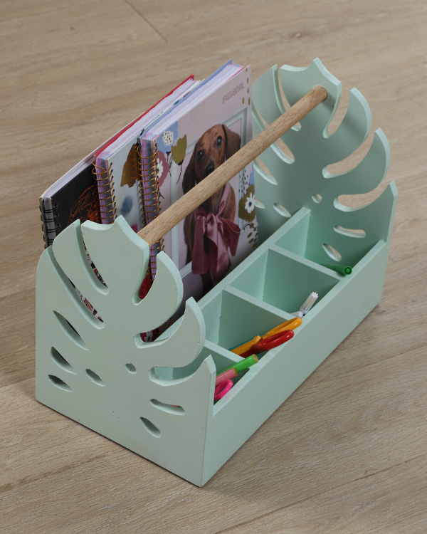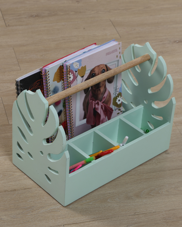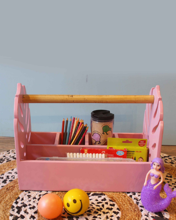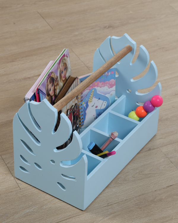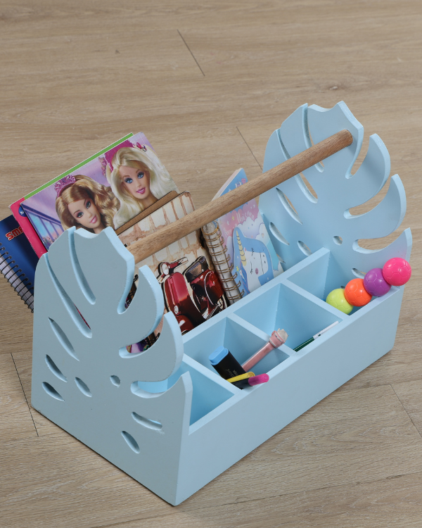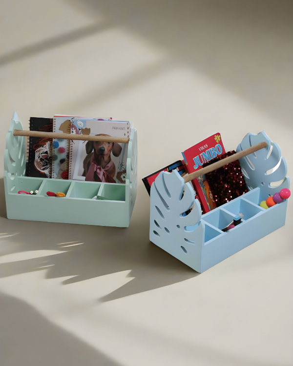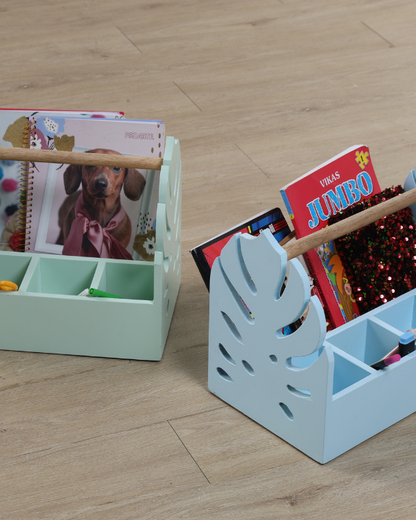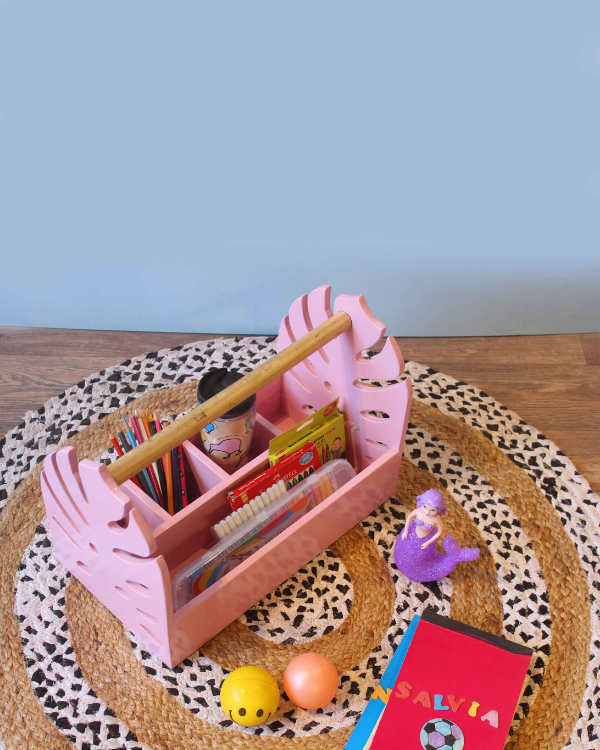 We designed this unique leaf-themed caddy/toolbox for kids, made from mango wood and MDF with the use of non-toxic colours for the safety of the child with these two beautiful colors, pink and green, where your child can keep all their stationary items, paintbrushes, colours, toys, and books. Inside, it has 4 small compartments and 1 large compartment. And this caddy/toolbox encourages children to develop hand-eye coordination skills while also teaching them about basic building techniques and keeping their daily utility items in a proper way. Kids love the active moves and realistic part-play inspired by this toy, and parents will too! Also, it could be the best gift for up to 3-year-old kids.