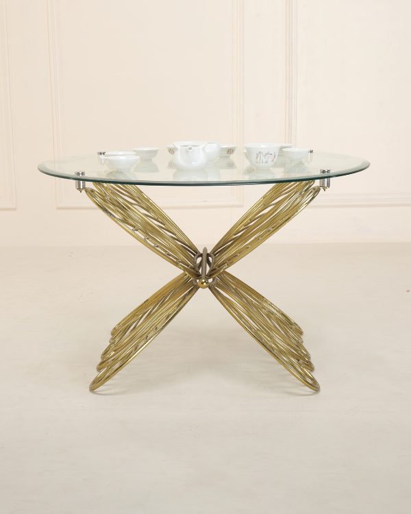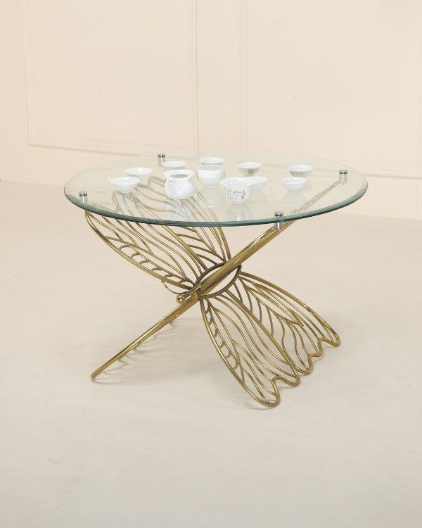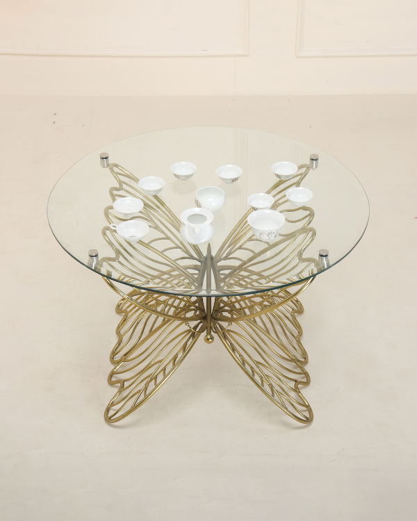 Crafted with care from high-quality glass and durable iron, this table features a butterfly-inspired design that adds movement and charm to your space. Moreover, the golden finish on the iron base enhances its visual appeal, offering a refined balance of elegance and strength.