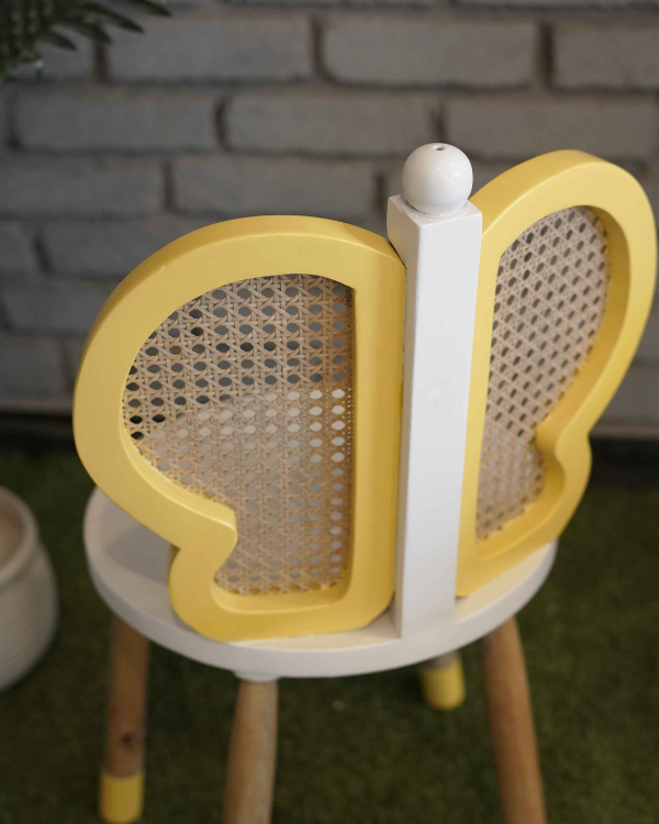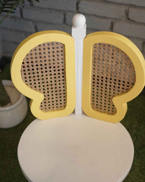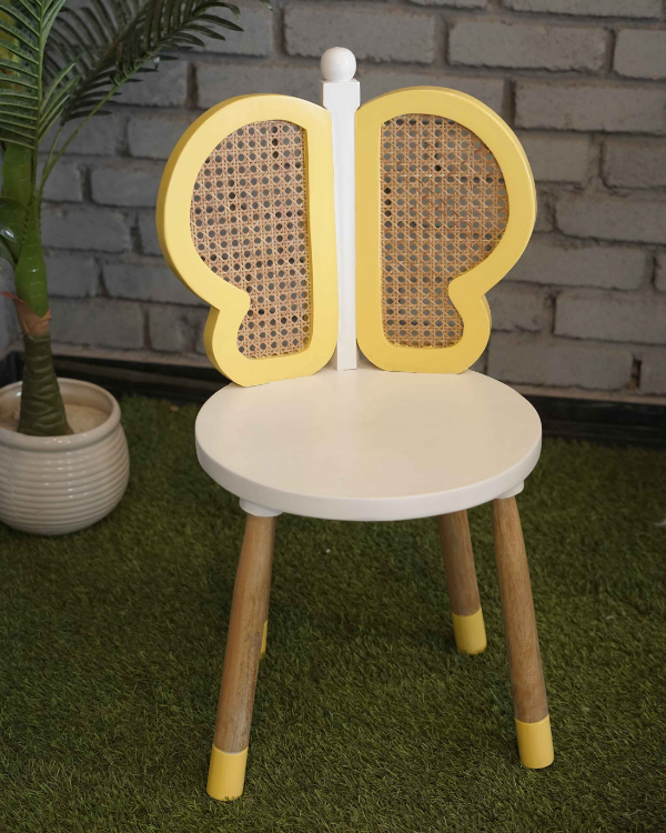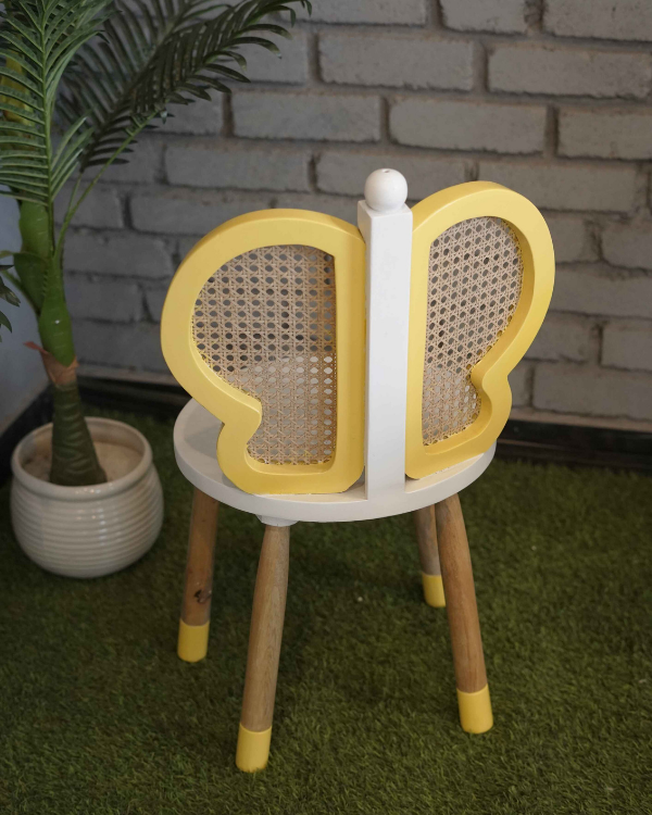Add charm and functionality to your child’s room with our Handmade Butterfly Cane Chair in a Pastel Pink, White, and Yellow White combination. Crafted from premium mango wood, this beautiful wooden study chair for kids is sturdy and stylish. The whimsical butterfly backrest, made from natural cane, adds a soft, creative touch. It’s perfect for studying, play, or relaxing with a book.
