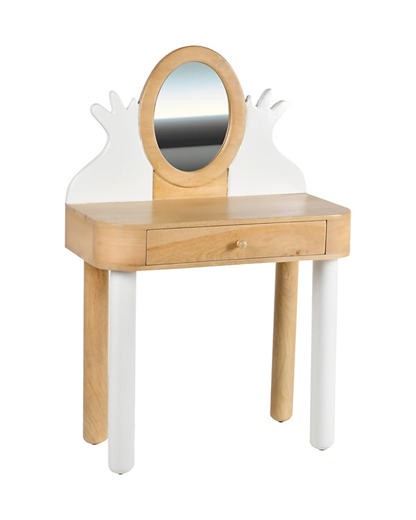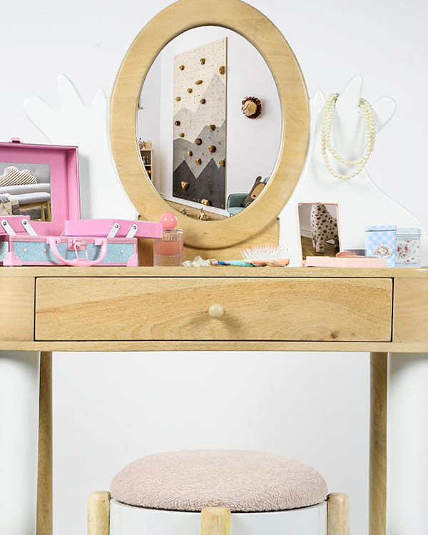 The vanity table boasts a natural wood finish combined with crisp white accents, creating a fresh and modern look. Its standout feature is the delightful oval-inspired mirror frame that sparks imagination and adds a fairytale feel to the space. A spacious tabletop provides plenty of room for little essentials, while a handy drawer keeps treasures neatly organized and out of sight.