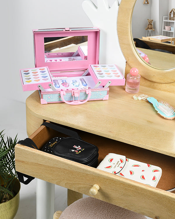 Whimsical Vanity Set–Wooden Dressing Table and Pink Stool with Storage