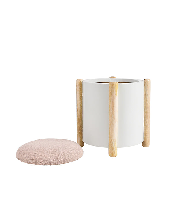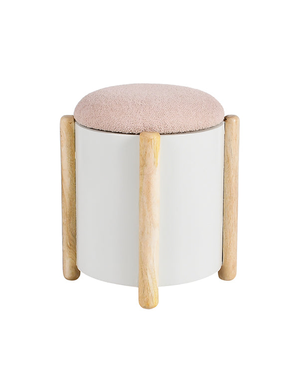 🎨 Finish: Natural Wooden Surface with White Accents & Pink Upholstery Stool