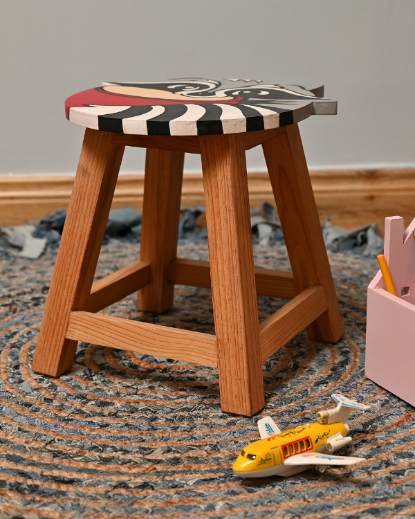This hand-painted four-legged stool can effortlessly support up to 50 kg, ensuring durability and stability for children and adults alike.