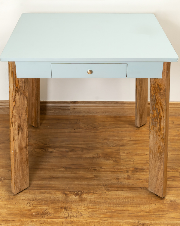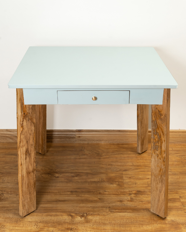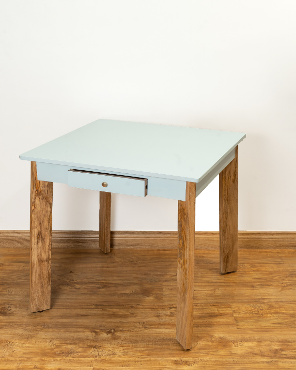 The table is designed with a shining sky blue top and a natural wood finish bottom, adding a touch of whimsy to the room.