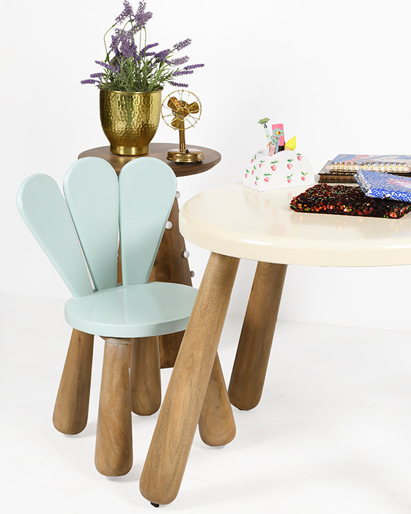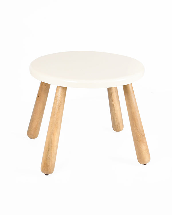 At the heart of the set is a round, cream-colored table with a smooth, spacious surface—ideal for drawing, crafting, snack time, or learning activities. The table stands on sturdy, natural-finish mango wood legs, offering long-lasting stability with a modern, warm aesthetic.