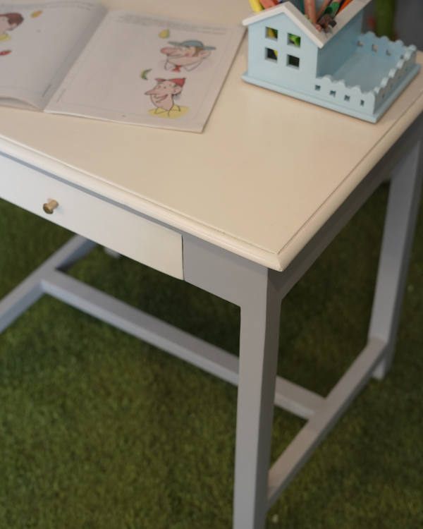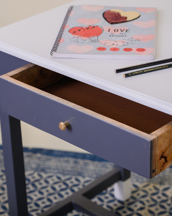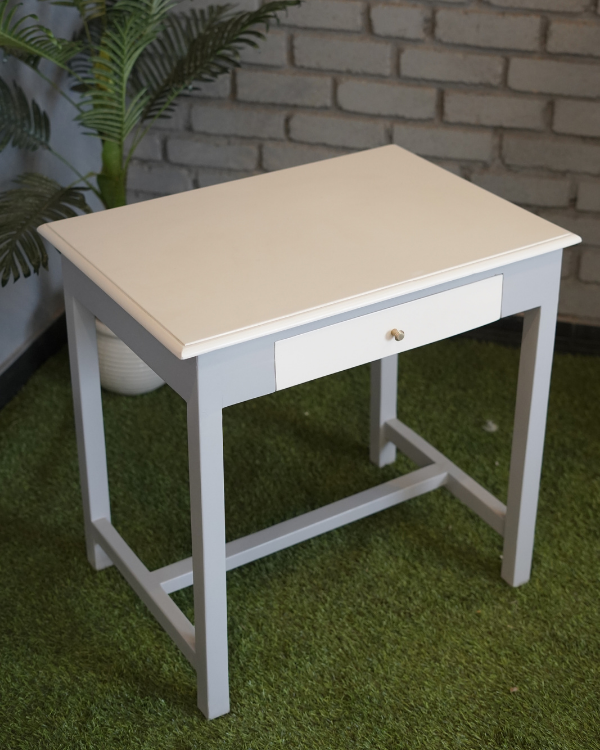 The table features a convenient storage drawer, perfect for keeping small utility items and stationery organized.