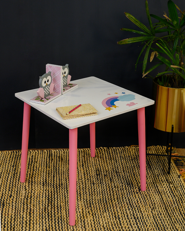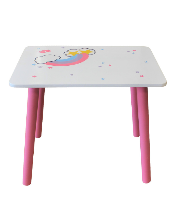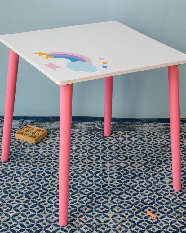 The table's bottom is painted in a charming pink colour, perfectly complementing the unicorn-themed design.