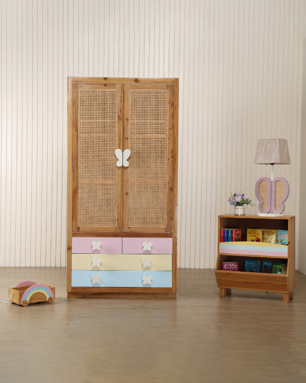 Introducing this Kids Butterfly Wardrobe, a delightful blend of style and functionality. Crafted from sturdy pine wood, this wardrobe is not just a storage solution but a piece of art for your child's room. Inspired by butterflies, it features four drawers with cute butterfly knobs, making it a charming addition to any space. The bottom two large drawers, painted in pastel pink, provide ample storage, complemented by two small drawers for added organization. The wardrobe's gates and drawers are uniquely crafted with a cane, creating a whimsical touch. The cream-white sides and natural pine wood finish add a touch of elegance, making it a perfect fit for any kids' room. With robust construction, the Nazraana Kids Butterfly Wardrobe offers both style and durability for your child's clothing storage needs.