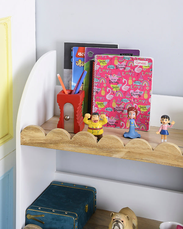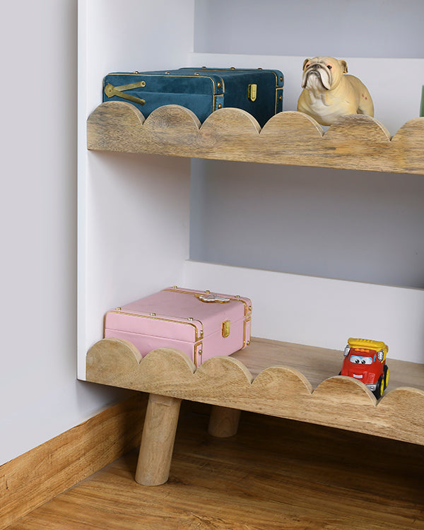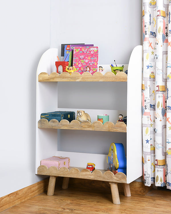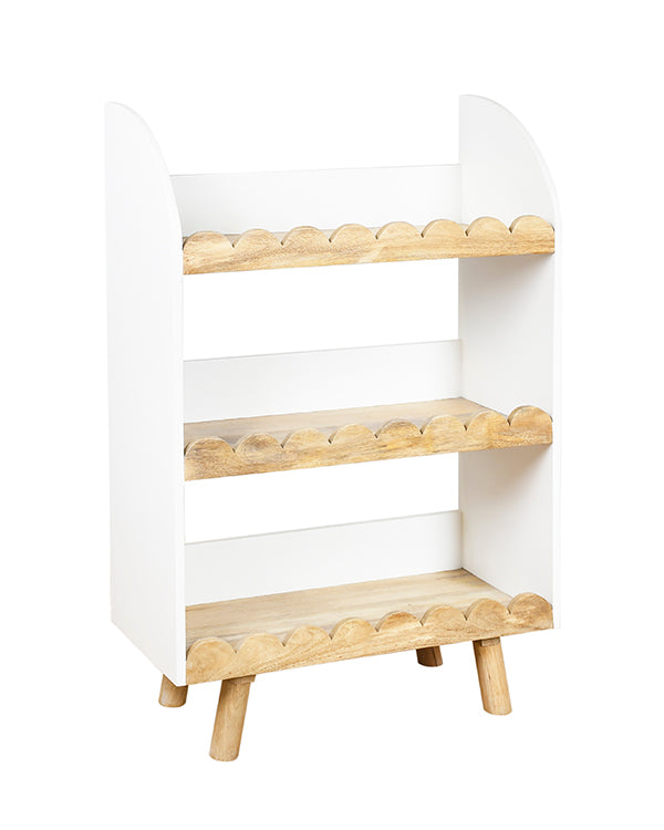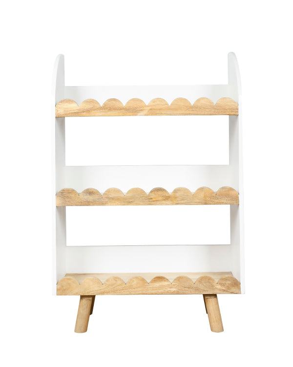 The three-tier open shelf design provides ample storage for books, toys, and keepsakes, helping kids stay organized while giving them easy access to their favorite items. Each shelf is thoughtfully crafted with scalloped edges and rounded corners, ensuring child-safe use without compromising on style.