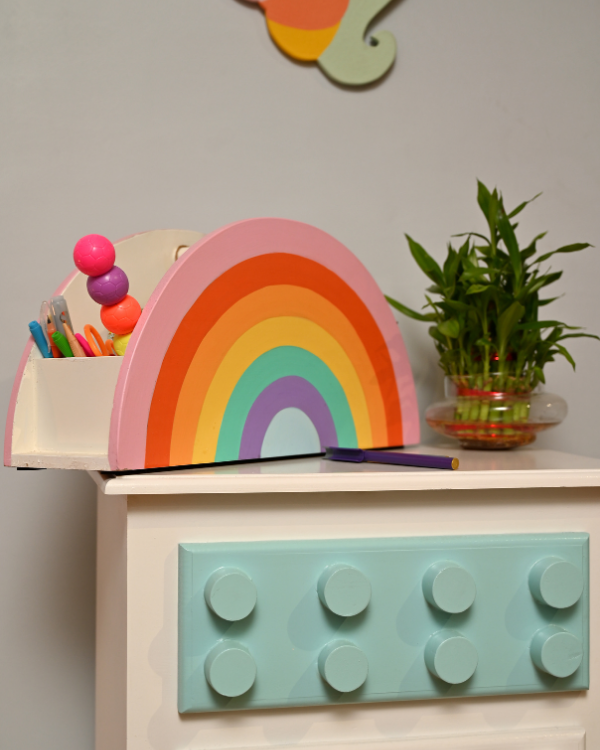 We created these hand-painted Rainbow-themed Kids Stationary organizers. This multi-functional desk organizer is constructed of high-quality MDF and Mango Wood handles water resistant and nontoxic colours for the child's safety and a well-crafted finish with good durability. This desk organizer has four sections for organizing your child's stationery requirements: pens, markers, pencils, pins, paper clips, and so on. This is also an excellent tool for educational purposes, as children may learn how to clean and arrange their filthy desks with a lovely rainbow stationary organizer. The proper size allows it to be used on any desktop; give this excellent stationery organizer to your child and make them happy.