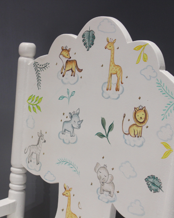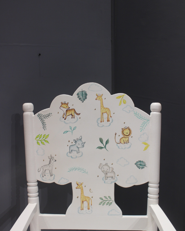 The chair's whole white color adds a touch of elegance, while the hand-painted animal motifs on the backrest bring a sense of whimsy and playfulness to the design.