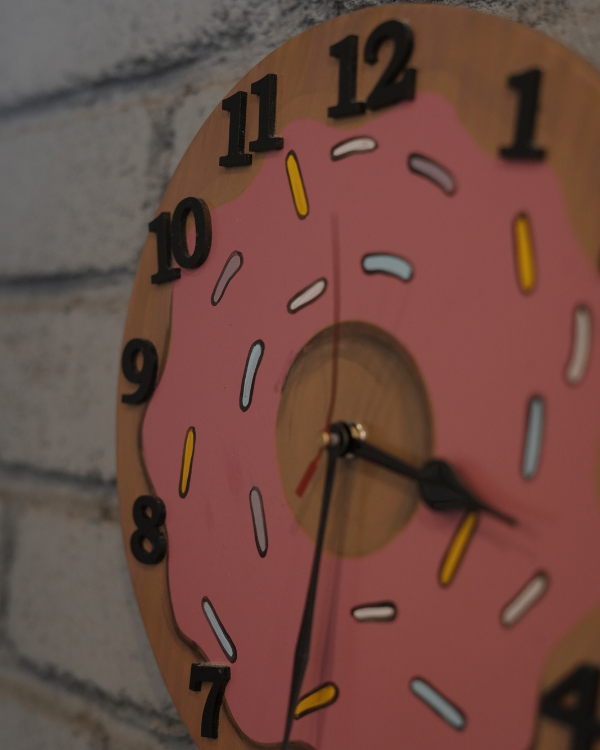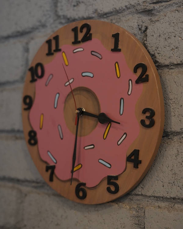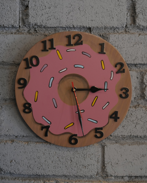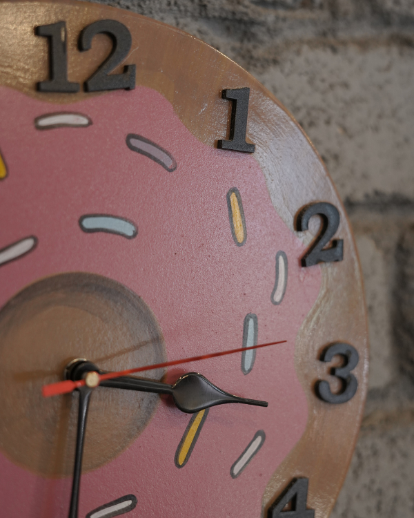 Whimsical Design: This clock features a charming doughnut shape with a brown "doughnut" base, topped with pink "creamy" icing and colourful sprinkles. Each detail is meticulously hand-painted to create a realistic and playful look.