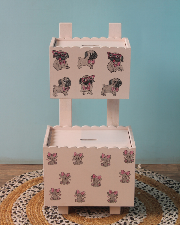 A perfect and beautiful storage solution to organize all your kid's stuff in one place. We present you a pink-colored, handpainted, cute little elephant print 2-tier storage basket organizer with a removable lid so you can use it as per your needs. This multipurpose daily utility storage basket is made from mango wood, and MDF also uses nontoxic colors for the safety of the child. This basket organizer can be used to keep your kid's accessories, diapers, toys, books, or clothes; it is an ideal storage basket for organizing your kid's toys and his little stuff. This attractively designed 2-tier elephant print storage basket organizer can get anyone's attention in the room. And it can blend perfectly well with any room decor/interiors in the house.