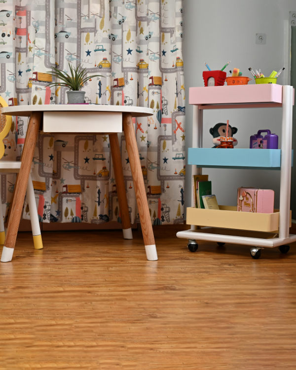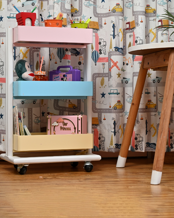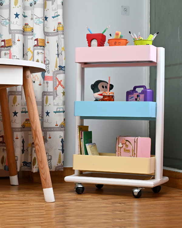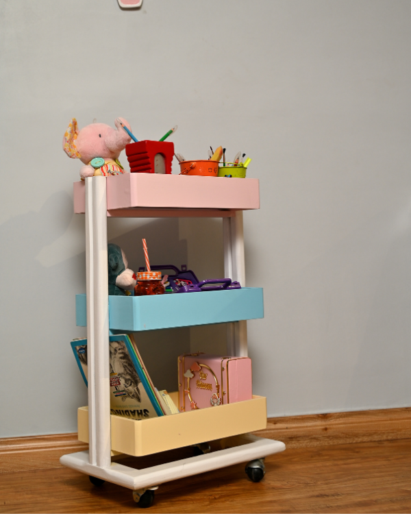 We Designed This Wooden Handpainted Trolley Rack, which provides a 3-layer storage trolley for kids and a small floor space. Made from high-quality mango wood and MDF with the use of beautiful, nontoxic pastel colors for the safety of the child. This multipurpose storage trolley rack can be used in the kid's room, living room, bedroom, and kitchen, where kids can easily store their all-day utility stuff like stationery items, books, toys, etc. There are four 360° rolling wheels at the bottom of the rolling trolley shelf, where kids can easily move without any hassle. And can be moved and placed in every corner of the house as needed, and could be a perfect gift for children.