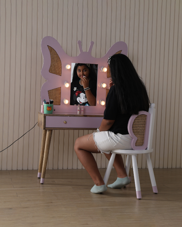 Let your child sparkle like royalty with our enchanting Kids Butterfly Dressing Table with Mirror and Lights – a magical blend of functionality and fairy-tale charm. Designed by Nazraana Kids Store, this beautifully crafted dressing table features a whimsical butterfly silhouette that instantly brings imagination to life.