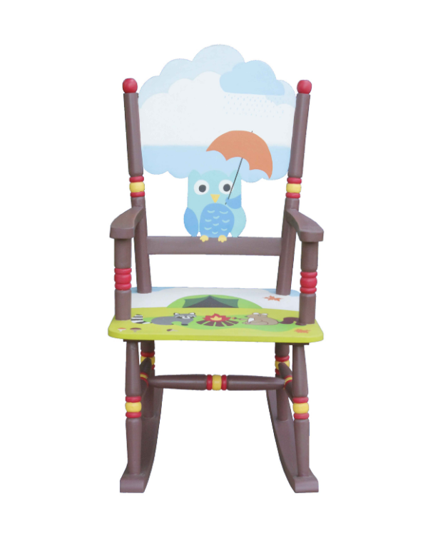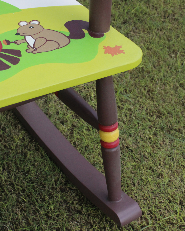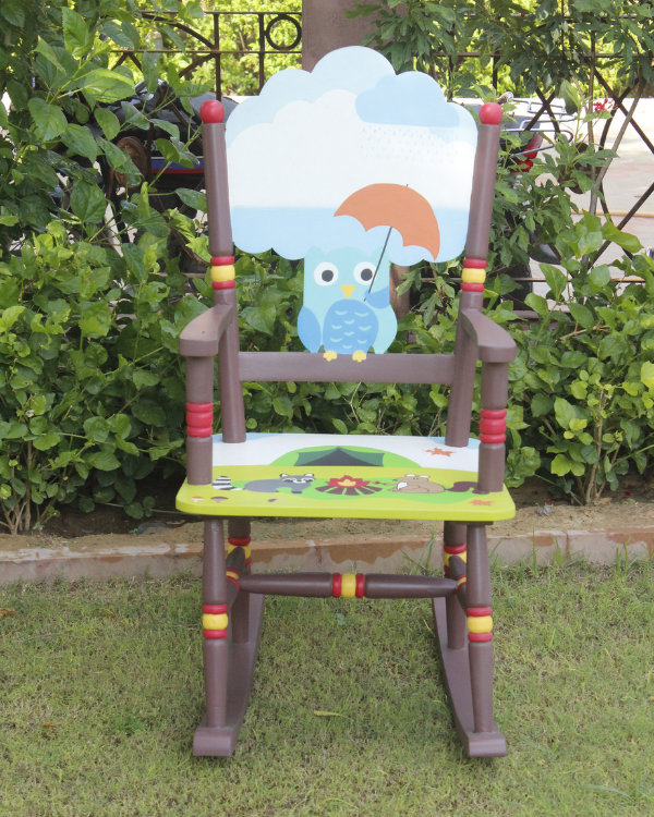 The seat of the rocking chair is adorned with beautiful hand-painted paintings of animals enjoying a cosy campfire.