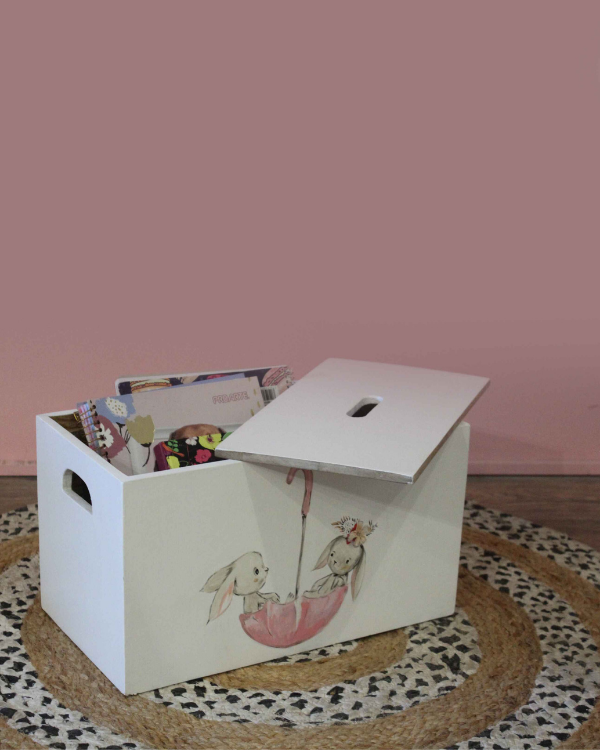 We designed this cute handpainted rabbit-themed set of 2 box organizers for kids, made from mango wood with the use of high-quality, nontoxic colours for the safety of the child. Tidy and organize small toys, like Legos, cars, or soft toys. This personalized box is an ideal toy storage box and makes a lovely kid's birthday gift. This sorting box is stylish toy storage without resorting to plastic crates. Mound the boxes and add the lid when you want to hide the toy clutter. We created this storage box to give kids their own space to keep little bits and bobs and special toys organized. Particularly with small toys. When children's toys are scattered all over the house or make the house messy. Then we came up with this very simple system that will fit nicely anywhere in your home, that kids can use themselves...and Tidy Up!