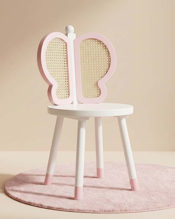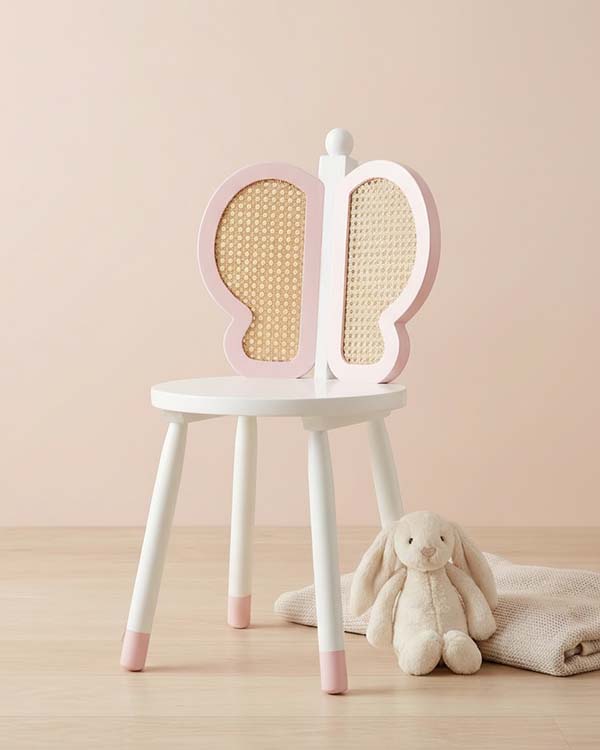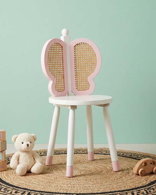 Add charm and functionality to your child’s room with our Handmade Butterfly Cane Chair in a Pastel Pink, White, and Yellow White combination. Crafted from premium mango wood, this beautiful wooden study chair for kids is sturdy and stylish. The whimsical butterfly backrest, made from natural cane, adds a soft, creative touch. It’s perfect for studying, play, or relaxing with a book.