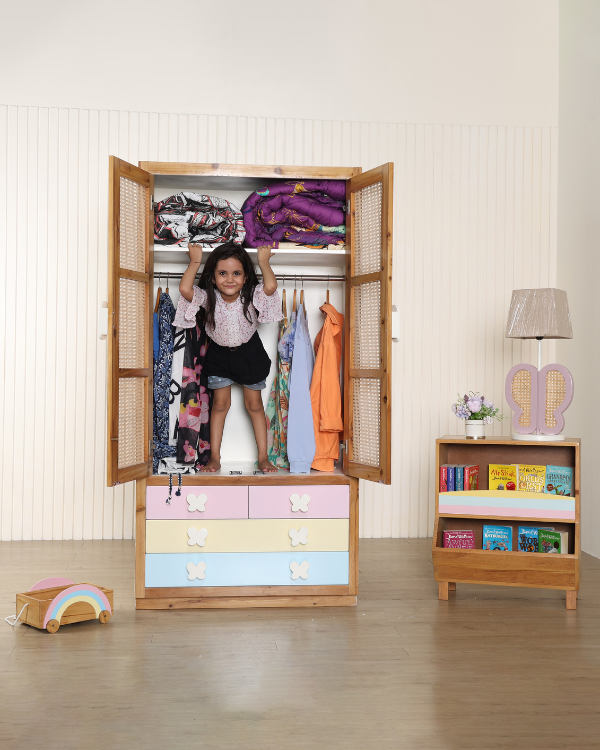 Introducing this Kids Butterfly Wardrobe, a delightful blend of style and functionality. Crafted from sturdy pine wood, this wardrobe is not just a storage solution but a piece of art for your child's room. Inspired by butterflies, it features four drawers with cute butterfly knobs, making it a charming addition to any space. The bottom two large drawers, painted in pastel pink, provide ample storage, complemented by two small drawers for added organization. The wardrobe's gates and drawers are uniquely crafted with a cane, creating a whimsical touch. The cream-white sides and natural pine wood finish add a touch of elegance, making it a perfect fit for any kids' room. With robust construction, the Nazraana Kids Butterfly Wardrobe offers both style and durability for your child's clothing storage needs.