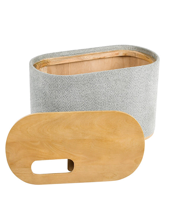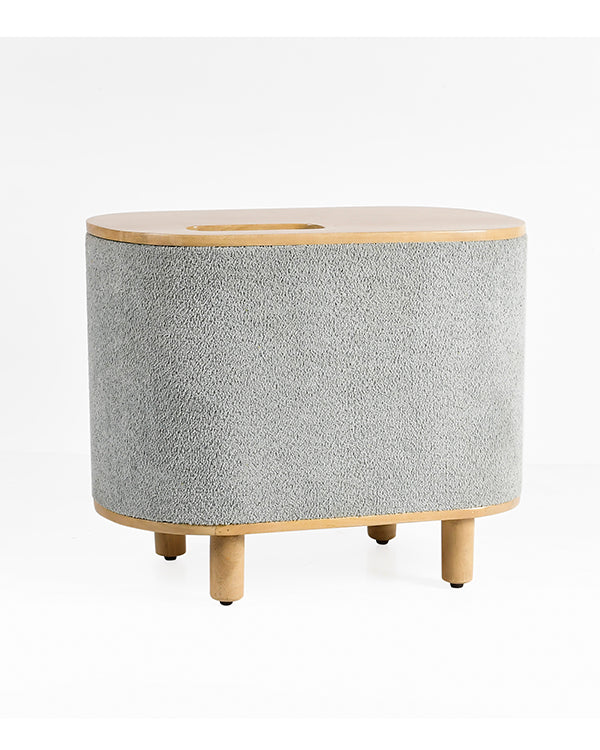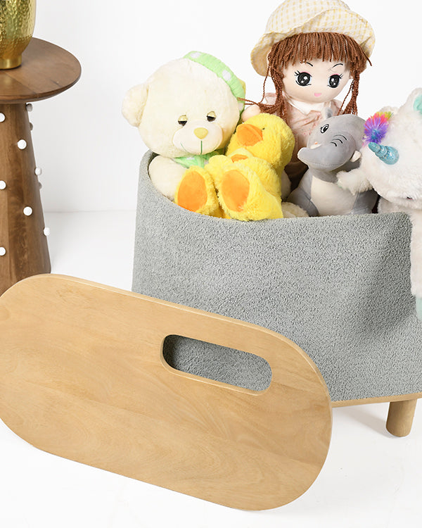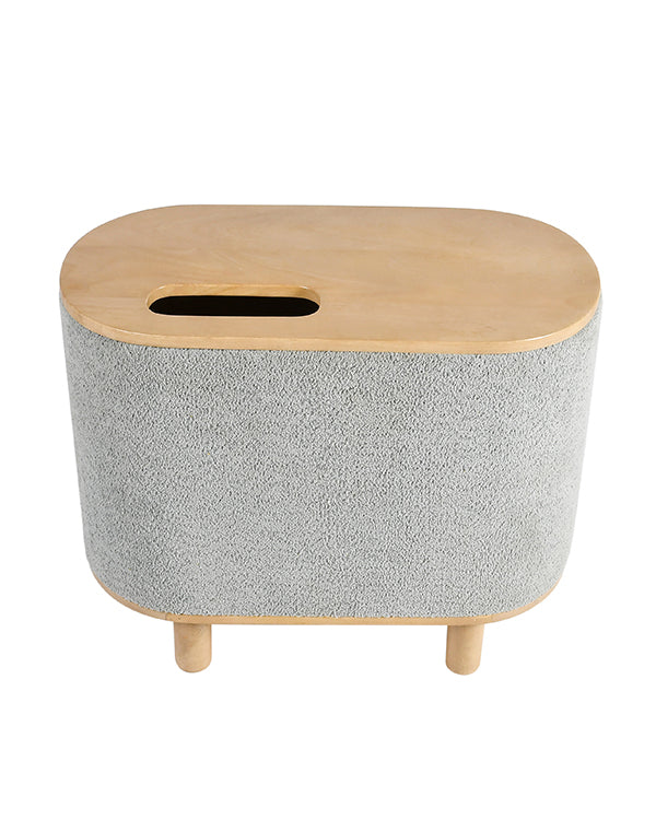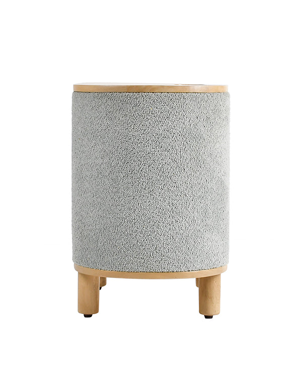Wrapped in plush pastel olive green Brookley fabric, the cylindrical body adds a cozy, textured charm to any room. The smooth wooden top, finished in a natural tone, features a convenient cut-out handle that acts as a lid — just lift it up to reveal a spacious storage compartment inside!