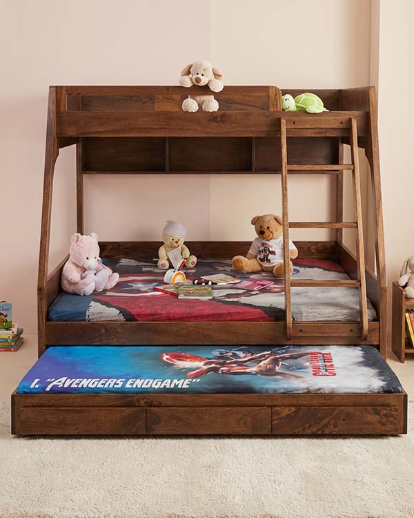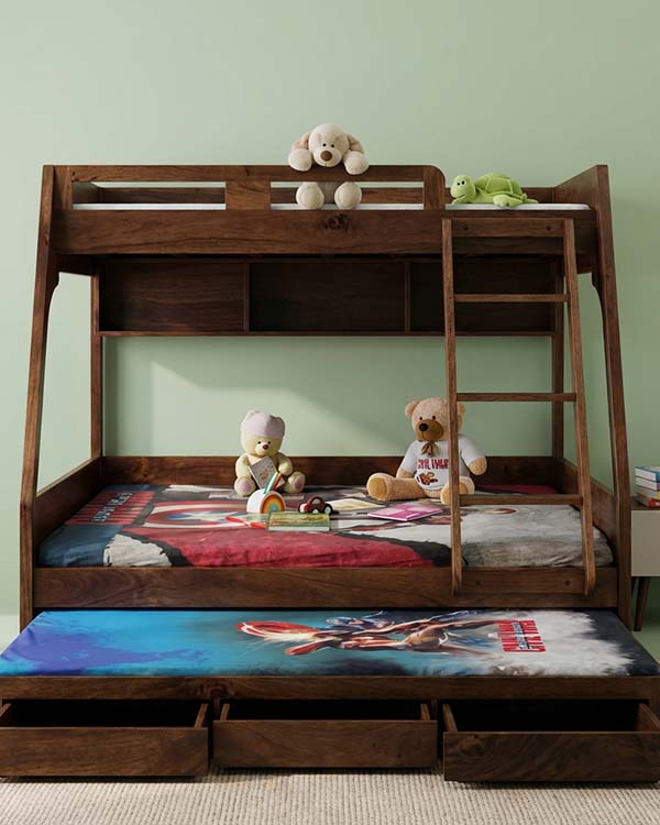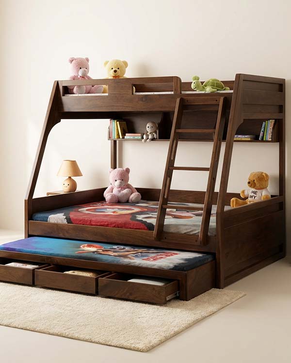 Designed for growing families and growing imaginations, our Nazraana Wooden Bunk Bed blends smart functionality with timeless style. Crafted in a rich natural wooden finish, this bunk bed instantly adds warmth and character to any kids’ room.