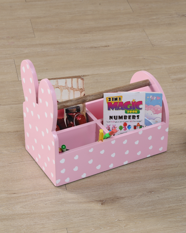We designed this handpainted multipurpose cute rabbit-themed caddy/toolbox for kids with four small compartments inside it. Where they can keep all the little stuff like stationery items, etc. This multipurpose caddy can be used for your table decor and desk organizer, and this product comes with a fine mango wood handle for kids so they can easily take it with them anywhere in the home. This handy product is for your kid's daily use for keeping all their utility items. And it is the best idea for the table/desk organizer and kid's stationery, and it is the best birthday gift for the child.